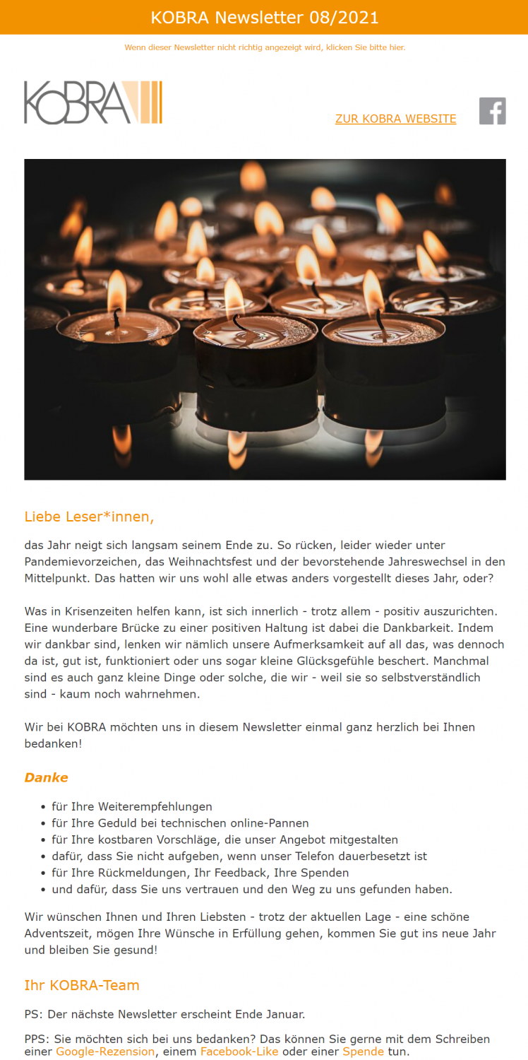 Der Versand von Newslettern ist für Non-Profit-Organisationen eine effiziente, kostengünstige und zielführende Marketing-Maßnahme. Er bietet Ihnen zahlreiche Möglichkeiten, um Ihre Leser:innen sowohl auf dem Laufenden zu haltenals auch für gute Taten zu begeistern.