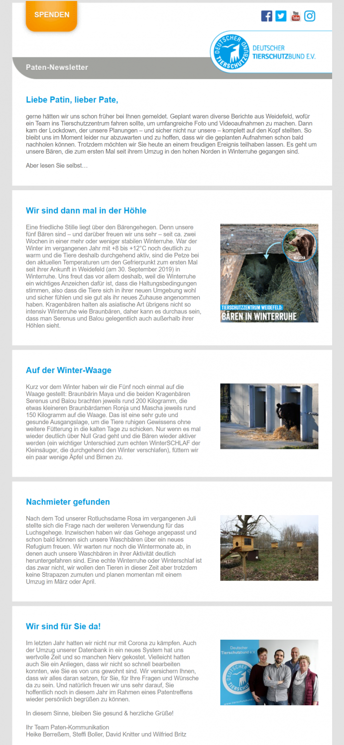 „Ein Bild sagt mehr als 1000 Worte” ist zwar eine Floskel, aber nicht unwahr. Durch Bilder wird Ihre vielleicht zunächst abstrakt wirkende Mission greifbar und verständlich. Außerdem sind Bilder im Newsletter das, was den Leser:innen als erstes ins Auge sticht, bevor der Blick zum Text wandert. Arbeiten Sie daher mit emotionalen Bildern, die Ihre Worte unterstreichen. Verlinken Sie Ihre Bilder außerdem, damit die Leser:innen durch einen Klick darauf z. B. zu weiterführenden Informationen auf Ihrer Website gelangen.