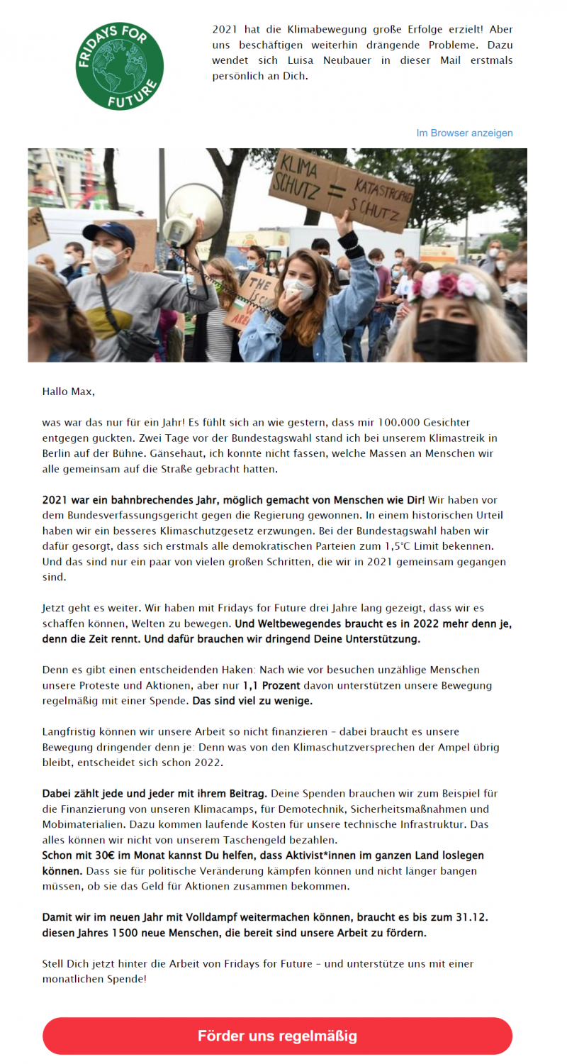 | „Macher“-Typ | – möchte mitwirken– ist von Ihrer Mission überzeugt | – auf dem Laufenden halten durch regelmäßige Updates zu Erfolgen– fühlt sich im Newsletter angesprochen durch konkrete Handlungsaufforderungen |