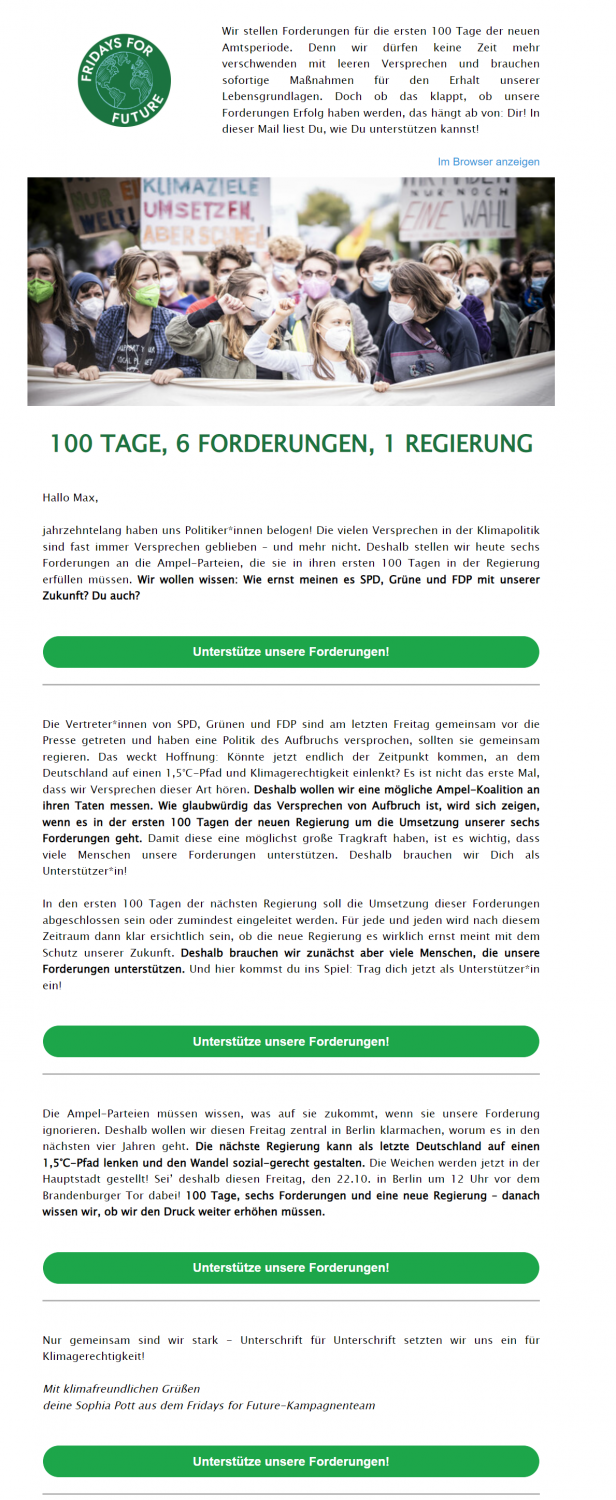 - 🗣️ Zur Hilfe auffordern: Machen Sie Ihre Kontakte zu Aktivist:innen, indem Sie Handlungsaufforderungen in Ihren Newsletter einbauen. So können Sie nicht nur Spenden generieren, sondern auch Ehrenamtliche für Ihre Mission gewinnen oder Unterschriftenlisten verbreiten.