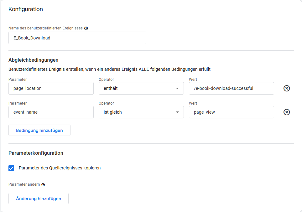 Ereignis-Einstellungen, wenn Conversions in Form von E-Book-Downloads gemessen werden sollen