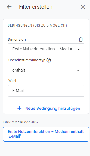 Daneben finden Sie ein Pluszeichen, das Sie anklicken müssen, um eine zusätzliche Dimension hinzuzufügen. Hier suchen Sie nach „Sitzung – Kampagne”. Um sich nun ausschließlich Ihre E-Mail-Kampagnen anzeigen zu lassen, scrollen Sie nach oben und klicken links auf „Filter hinzufügen”. Nun öffnet sich eine Sidebar, in der Sie im Feld „Dimension” die Option „Erste Nutzerinteraktion – Medium” wählen, als Übereinstimmungstyp „enthält” wählen und als Wert „E-Mail” eintragen.