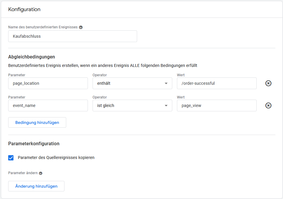 Und so würden Ihre Ereignis-Einstellungen aussehen, wenn Sie herausfinden möchten, wie viele Kaufabschlüsse in Ihrem Onlineshop Ihrem Newsletter zu verdanken sind: