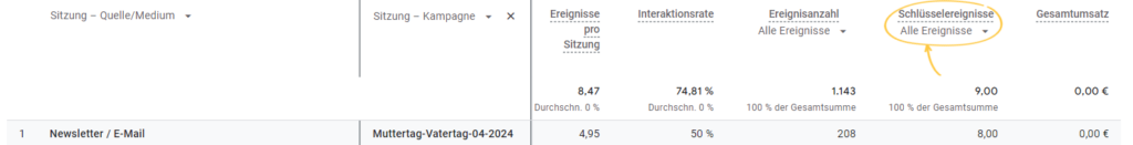 Nach diesen Conversion-Ereignissen können Sie im Drop-down-Menü bei „Alle Ereignisse” filtern und sich z. B. nur die Registrierungen anzeigen lassen, die durch Ihre Kampagne erzielt wurden. In der letzten Spalte der Tabelle können Sie außerdem den Gesamtumsatz sehen, den Ihr Newsletter generiert hat, falls Sie entsprechende Werte in Google Analytics 4 hinterlegt haben. 💸