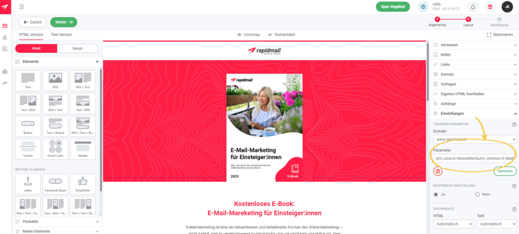 Mit rapidmail können Sie direkt im Newsletter-Editor rechts in der Sidebar unter „Tracking-Parameter“ alle UTM-Parameter angeben, die an alle Link-URLs im Newsletter gehängt werden sollen – oder alternativ die Parameter manuell in den gewünschten Link-URLs ergänzen: