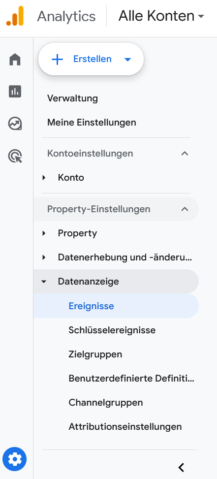 Dort öffnet sich ein Menü. Unter „Property-Einstellungen“ lässt sich bei „Datenanzeige“ ein Untermenü öffnen. Klicken Sie dort auf „Ereignisse“. In diesem Bereich sehen Sie eine Übersicht über alle Ereignisse, die Sie bereits angelegt haben und welche davon Sie als Conversion bzw. Schlüsselereignis markiert haben. Sie können hier auch bestehende Ereignisse bearbeiten und neue Ereignisse erstellen.