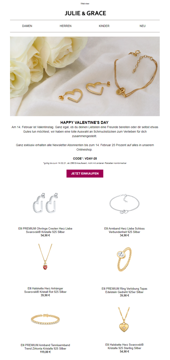 Praxisbeispiel für Newsletter-Conversions: Über den Call-to-Action-Button im Newsletter gelangen die Abonnent:innen von JULIE & GRACE in den Onlineshop, wo sie die abgebildeten Produkte kaufen können. Je mehr Produkte über den Klick im Newsletter im Shop verkauft werden, desto höher ist am Ende die Anzahl an erfolgten Newsletter-Conversions. (Newsletter erstellt mit rapidmail)