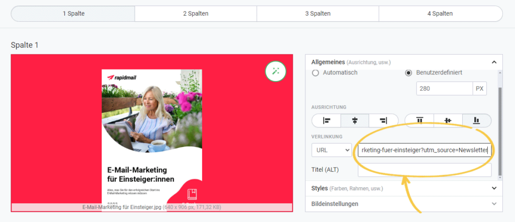 Im rapidmail Newsletter-Editor können Sie alternativ für einzelne Elemente eine Link-URL hinterlegen und an diese manuell die gewünschten UTM-Parameter hängen.