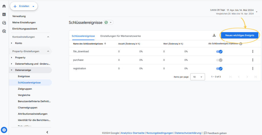Das neue Ereignis wurde in Analytics jedoch noch nicht erfasst. Sie müssen es daher vorab als Conversion bzw. Schlüsselereignis markieren. Klicken Sie dafür auf der Seite „Verwaltung” unter „Datenanzeige“ auf „Schlüsselereignisse“. Wählen Sie hier „Neues wichtiges Ereignis“ aus und geben Sie den Namen des soeben neu angelegten Ereignisses ein – fertig! Danach sehen Sie alle als Conversion markierten Ereignisse in der Übersicht: