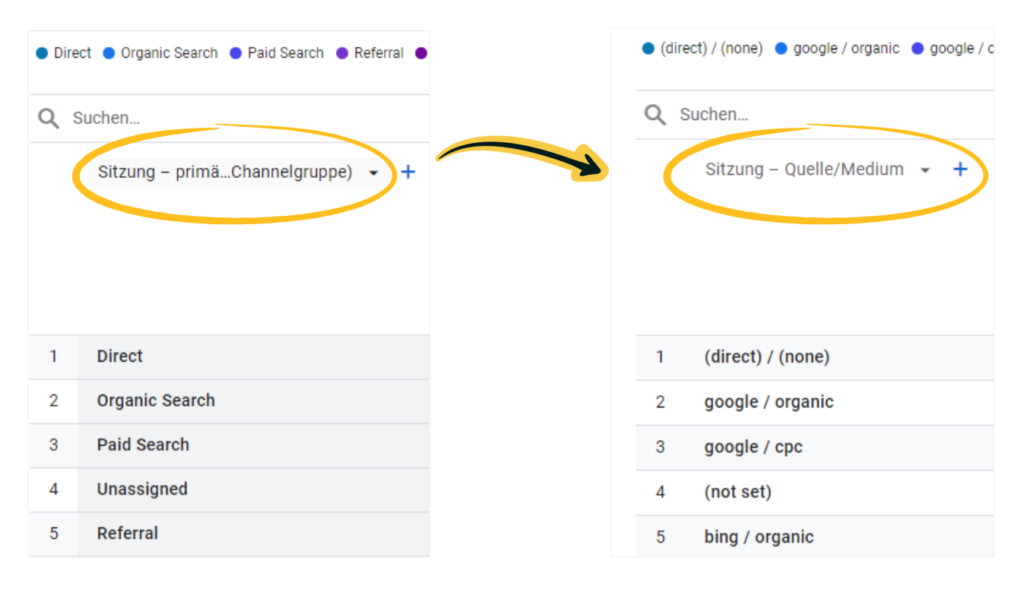 Öffnen Sie einige Tage nach dem Newsletterversand Ihr Google Analytics 4 Konto und navigieren Sie links in der Sidebar zu „Berichte“ und dann unter „Lebenszyklus“ und „Akquisition“ auf „Neu generierte Zugriffe“. Wählen Sie dann in der angezeigten Tabelle unterhalb des Diagramms links bei „Sitzung – primäre Channelgruppe (Standard-Channelgruppe)“ stattdessen „Sitzung – Quelle/Medium“ aus.