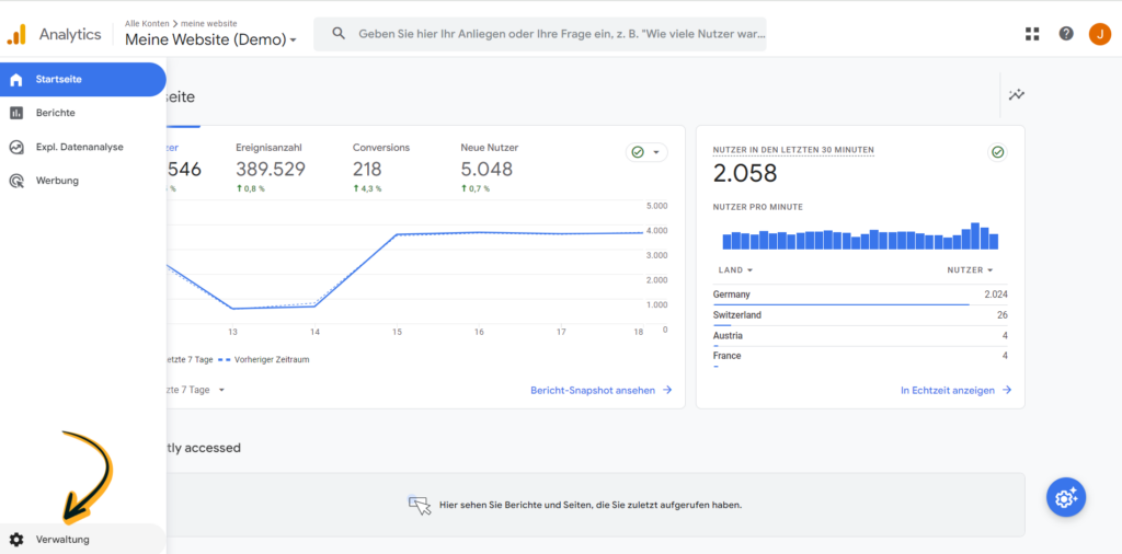 Los geht’s! Auf Ihrer Startseite in Google Analytics 4 klicken Sie bitte unten links in der Sidebar auf „Verwaltung“.
